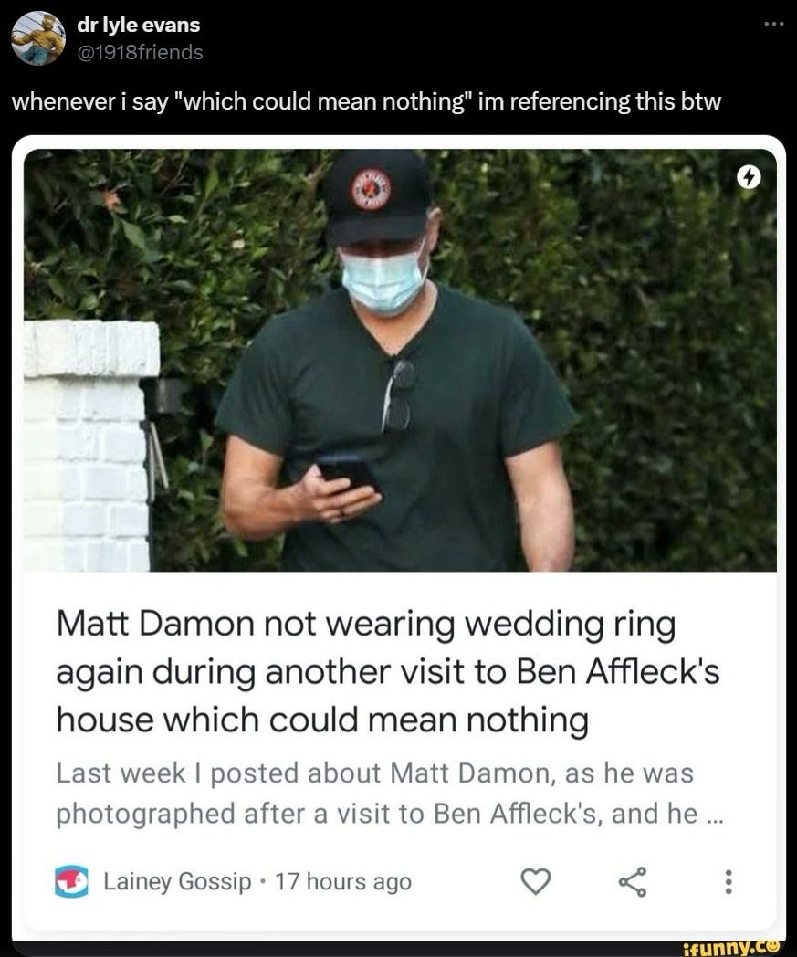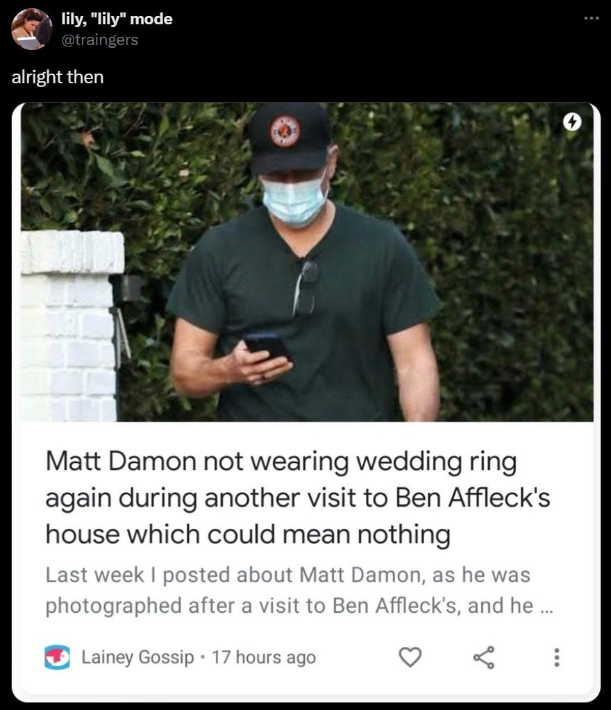 Let me explain: it all started with this post from January 2021 when Matt was papped not wearing his wedding ring outside Ben’s place. A month later someone tweeted it, because it had been (jokingly) interpreted to mean that Matt wasn’t wearing his wedding ring with Ben and maybe they’re gay for each other.